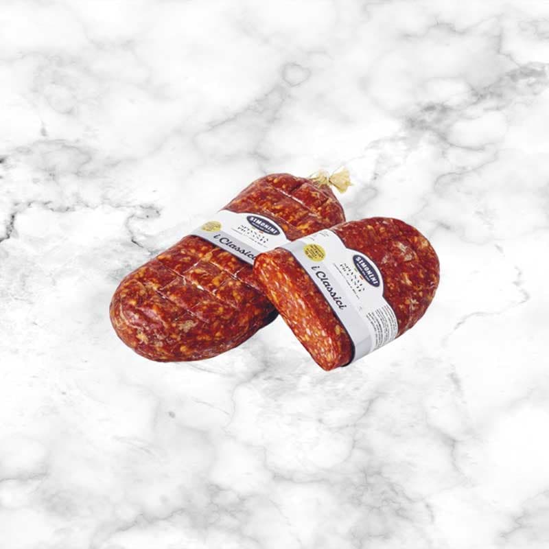 Simonini’s Spicy Spianata Schiacciata is a bold, flat-pressed salame crafted in the Calabrian tradition, offering a vibrant red colour, generous marbling and unmistakable chilli-infused depth. Made from premium pork seasoned with Calabrian peperoncino, garlic and aromatic spices, this salame delivers a lively, expressive flavour that is both fiery and beautifully balanced. Its distinctive flattened shape allows for even curing and produces slices with an appealing rustic appearance — thin, broad and richly coloured. The aroma is intense and inviting, marked by warm spices and the smokiness of the peppers.